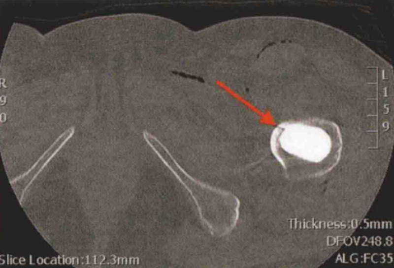 图3 CT扫描轴位片提示左侧股骨近端无移位假体周围骨折
