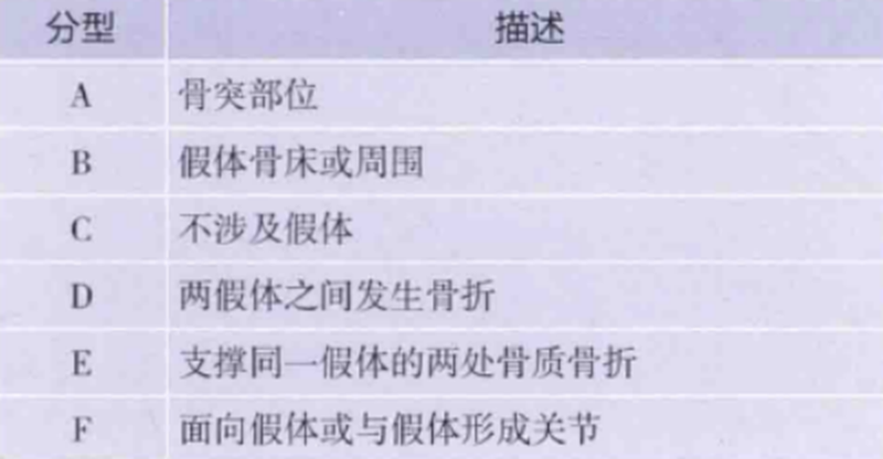 D型(两假体之间发生骨折):髋关节假体与膝关节假体之间发生骨折。