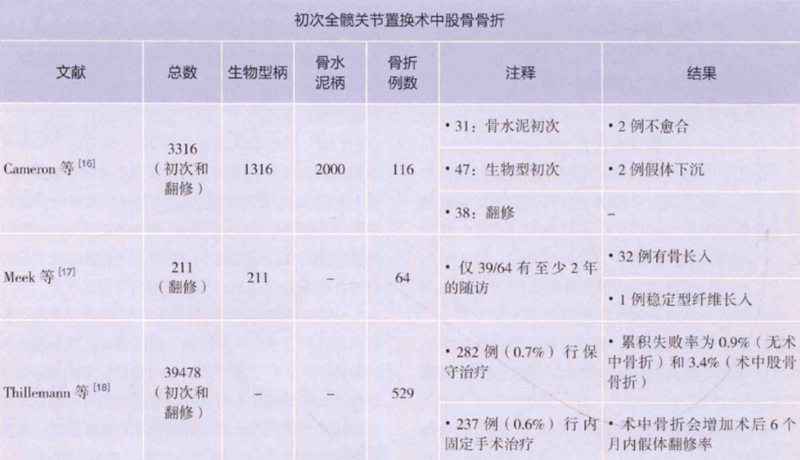 总的来说,术中假体周围骨折并不常见,尤其是在初次THA中。因此,关于此类患者预后的临床报道很少。表2总结了术中假体周围骨折的发生率及治疗结果。IPF在使用生物型柄及翻修手术中相对多见,并且在翻修术后6个月内发生的风险较大。