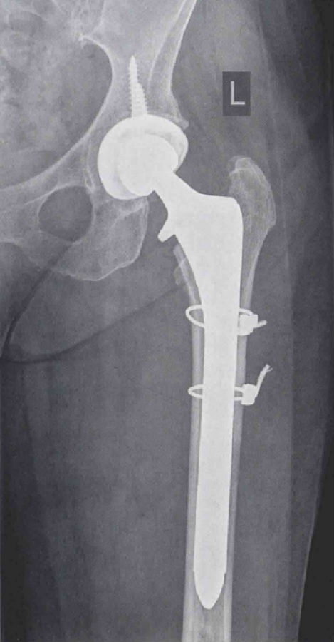 图4 左髋翻修术后正位X线片,使用远端固定型柄跨过骨折端,达到良好的远端固定效果1