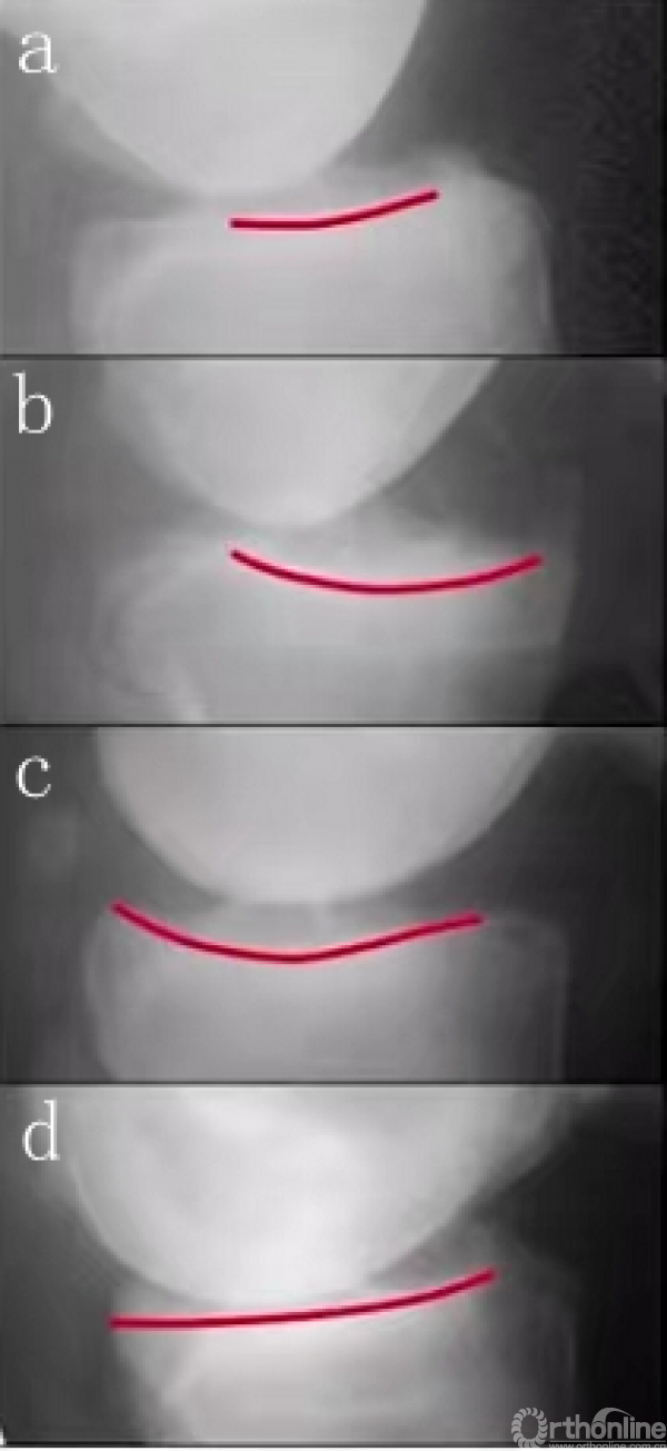 双髁重叠侧位片检查。a.ACL功能完好;b.ACL功能完好;c.ACL缺失;d.ACL缺失(半脱位)