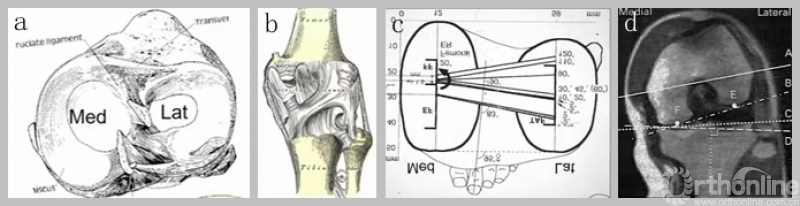 a.内侧平台较大,为”c”半月板;b.外侧平台为“D”半月,韧带符合维持静态稳定;c.屈伸活动中,内侧后滚8mm,外侧后滚20mm;d.屈曲90°,内侧间隙约1-2mm,外侧间隙约10mm。解剖及力学的基础,决定内侧活动平台是其最佳选择。