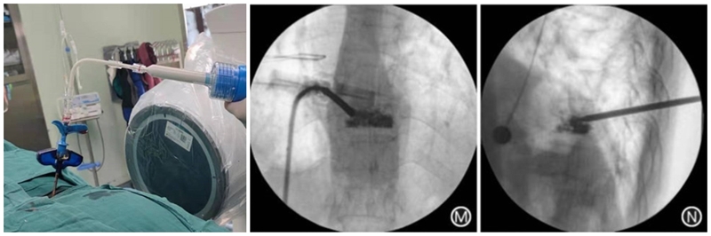 (5)扩张球囊:注入造影剂扩张球囊过程中,注意观察术中正侧位透视图像,控制压力值,不必苛求球囊顶到上下终板,以免发生医源性终板破裂,造成椎间隙骨水泥渗漏可能。注意弯角球囊扩张完毕后拔除顺序:先拔导丝再拔球囊。
