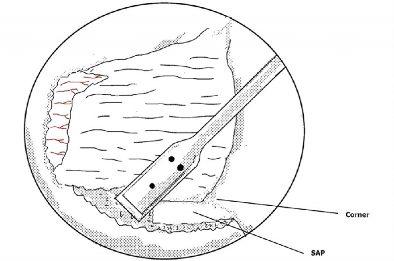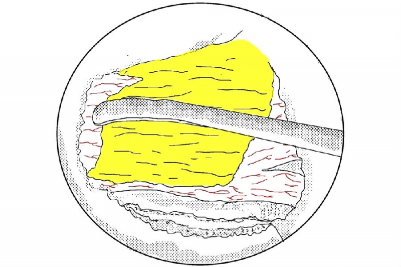 6. 使用骨凿将磨薄的下关节内缘凿除显露Corner和上关节突内缘;