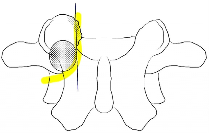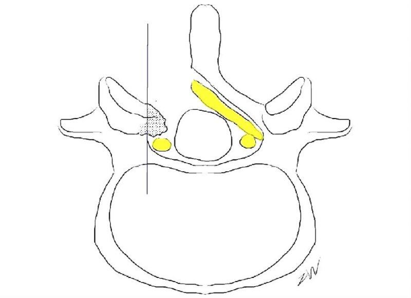 去除部分椎板上缘骨质尤其是与上关节突结合的部位利于黄韧带的切除及椎弓根内壁的显露。这个部位显露神经根的风险最小。