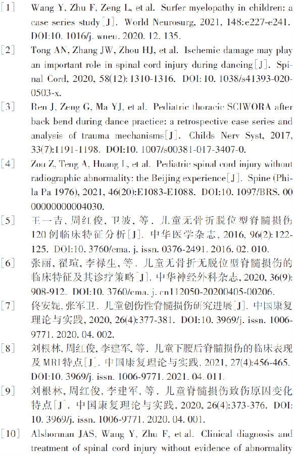 近年来,越来越多的儿童参与下腰训练,此类型损伤的发生率呈快速升高的趋势[16-17]。据报道,1992年至2002年舞蹈下腰训练导致脊髓损伤患者在所有儿童脊髓损伤中仅占4.0%,至2019年已高达33.9%,在无骨折脱位型脊髓损伤中占比达64.1%,下腰训练已成为儿童脊髓损伤的主要原因[8-9,17]。