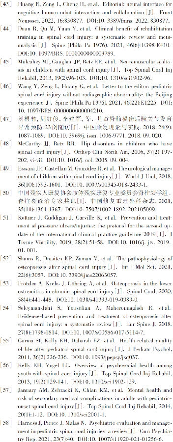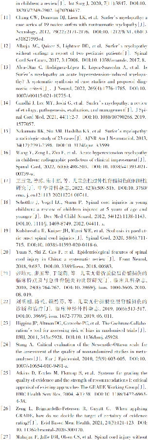 文献纳入标准:(1)儿童脊髓损伤临床研究的全文报道;(2)已发表的临床指南或专家共识;(3)有明确研究结果且为定量资料;(4)年龄≤14岁。