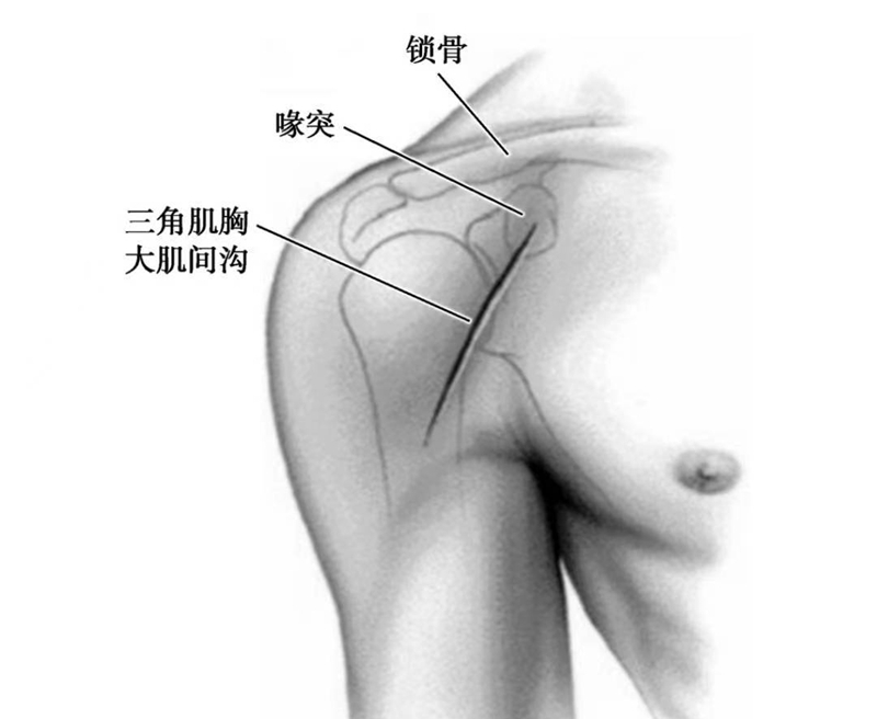 腋部入路沿皮肤切口切开后,以手指伸入皮下潜行分离,向上、外侧牵开切口两侧皮瓣即可显露三角肌胸大肌间沟;前部入路沿皮肤切口切开皮肤皮下组织后,仔细止血,暴露三角肌胸大肌间沟(图4)。