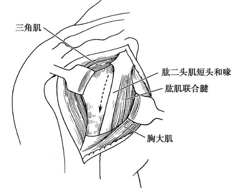 沿肌间沟继续分离,注意保护头静脉。分别向内、外侧牵开胸大肌、三角肌,显露肱二头肌短头和喙肱肌联合腱(图5)。