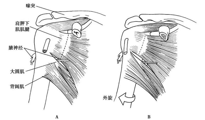 图6 腋神经于肩胛下肌下缘通过四边孔,外旋上肢使腋神经远离肩胛下肌止点