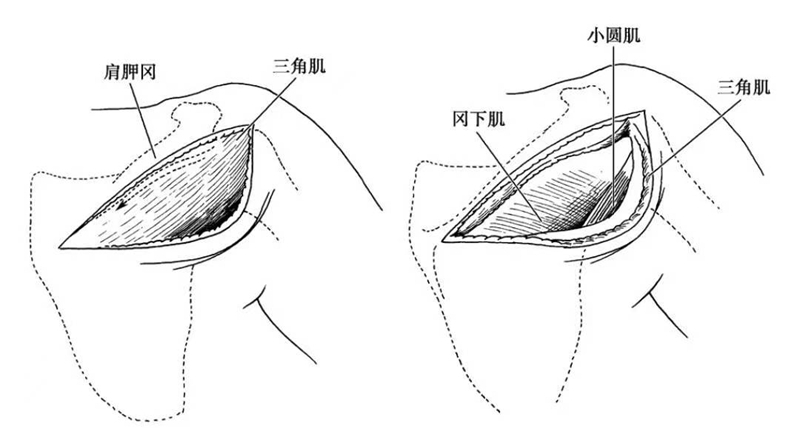 沿皮肤切口切开皮肤皮下组织,于三角肌在肩胛冈的起点自外向内切断三角肌,骨膜下剥离三角肌并向下翻转三角肌,显露冈下肌和小圆肌(图11)。