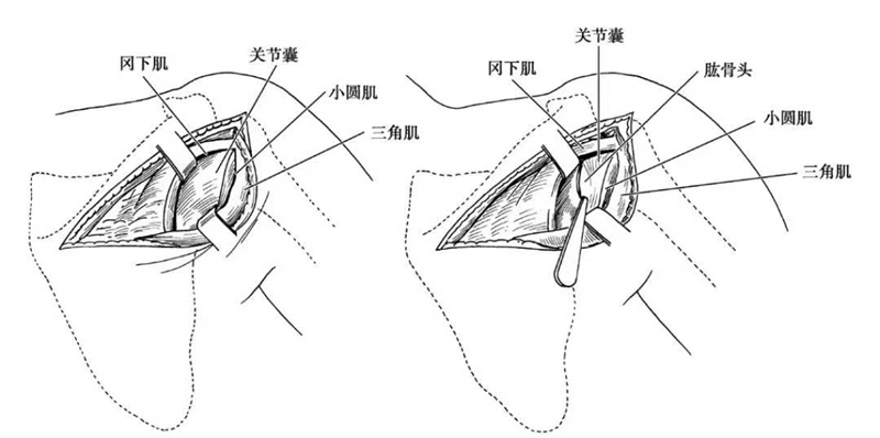 切开冈下肌和小圆肌间的筋膜,沿肌间隙用手指做钝性分离,分别向上牵开冈上肌,向下牵开小圆肌,显露肩关节囊后下部,在接近肩关节盂边缘处纵行切开关节囊即可显露关节腔、肱骨头及盂唇(图12)。
