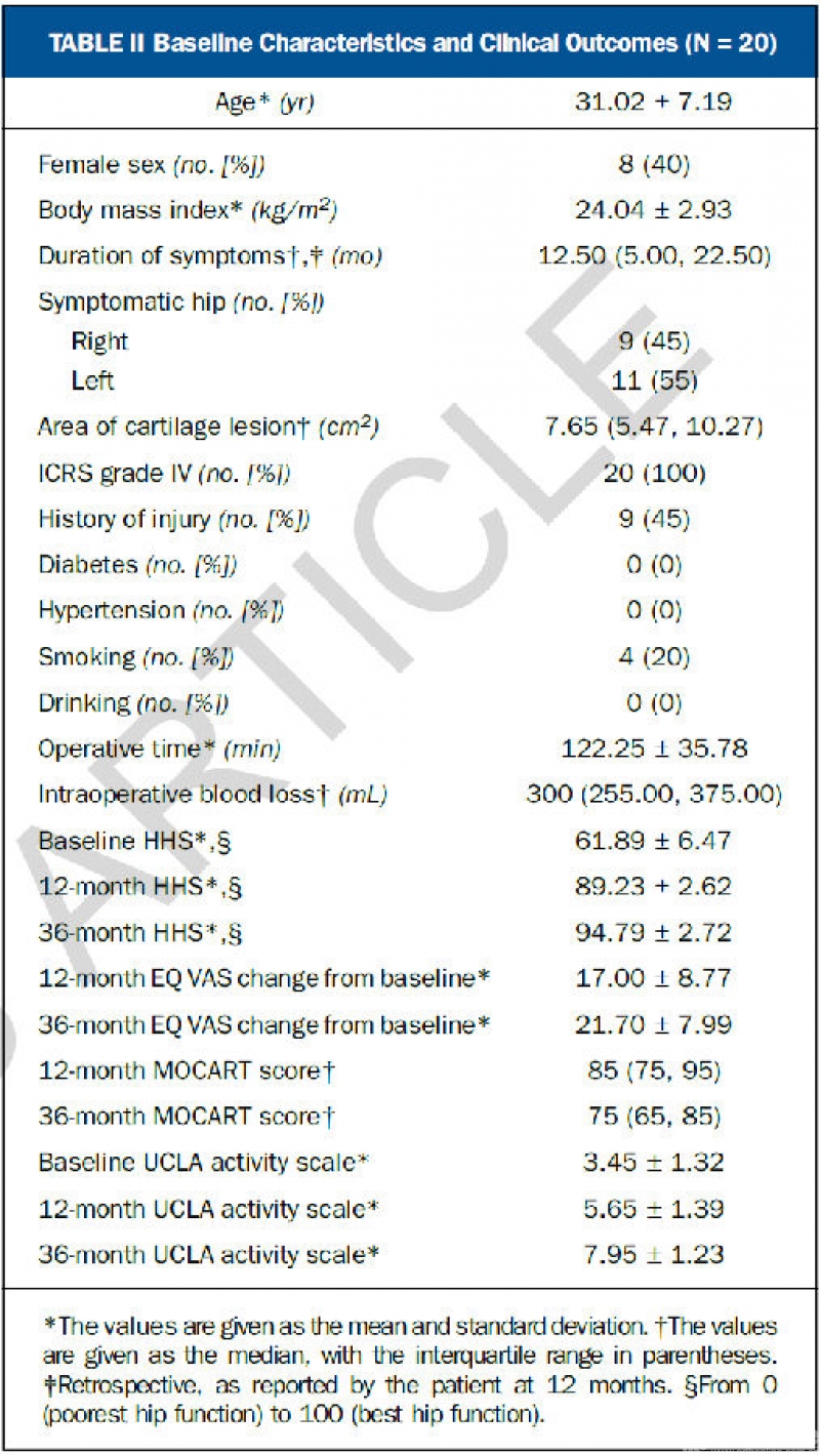 这项ACCG新技术综合利用了:右第6-9肋取得不含软骨膜的肋软骨、髋关节Smith-Petersen入路、关节囊的保护、病灶的清理,可吸收螺钉固定以及股骨头关节面重塑等技术。根据3年的随访结果显示(原文表2),入组的20例年轻患者(18-40岁)髋关节功能评分(HSS)和UCLA活动评分均较治疗前得到显著性提升,疼痛明显得到明显缓解,并且在随访后期没有观察到分值的下降——不仅提示了良好的早期临床效果,也预示着远期重建效果的稳定性。