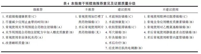 推荐意见:不推荐TKA术后常规使用阿片类药物镇痛,在补救镇痛情况下可使用阿片类药物。(无证据等级;推荐强度为专家建议)(专家意见:同意90%,不确定0,不同意10%)