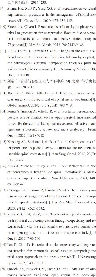 近年来微创技术和内固定器械得到了广泛应用,脊柱转移瘤的手术方式也发生了很大变化。传统的开放手术虽然可以缓解疼痛和神经功能损害,但对脊柱转移瘤患者的筛选有严格的要求,通常要求预计生存期>3个月[3]。