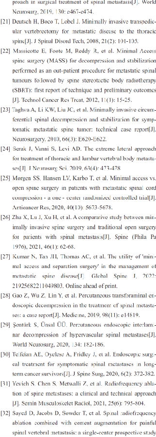 鉴于脊柱转移瘤患者通常术后需要进行放射治疗和全身治疗,因此要尽可能缩短手术与术后辅助治疗的间隔时间。微创手术组织损伤小、术中失血量少、住院时间短、术后并发症发生率低,可以在术后短时间内开展后续治疗,尤其适用于全身情况较差而无法耐受开放手术的脊柱转移瘤患者。