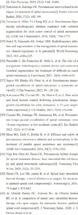 需要注意的是,射频消融仅限于应用于距脊髓和神经根安全距离的脊柱转移瘤。Senol等[35]对接受射频消融联合椎体成形术的41例脊柱转移瘤患者进行回顾性研究,使用VAS评分和ODI评估术前和术后的疼痛强度和生活质量。研究结果显示,围手术期无脂肪栓塞、内脏或神经损伤、急性低血压等严重并发症,无一例死亡。与术前相比,术后6个月平均VAS评分和ODI均显著降低。Pusceddu等[36]对35例脊柱转移瘤患者行射频消融联合椎体骨水泥增强手术,共治疗41个椎体后部转移灶。通过VAS评分评估术前和术后疼痛程度,平均VAS评分从术前的5.7分(95%CI:4.9~6.5)下降到术后的0.9分(95%CI:0.4~1.3)(P<0.001),射频消融后1周至1年的VAS评分随时间降低,表明疼痛缓解是即时且持久的。