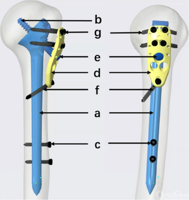 图6 Doursounian L等[20]设计的肱骨近端钛合金髓内固定装置