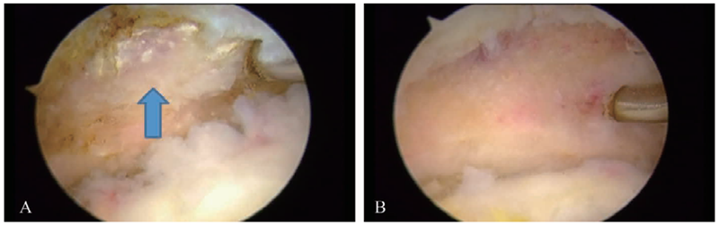 A.盂唇部分剥离后显露AIIS增生(箭头);B. 对髋臼缘上方的AIIS进行打磨成形(AIIS成形术)形成较为平坦的骨床