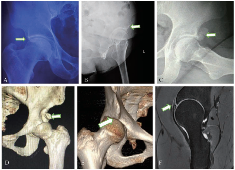 A.骨盆前后位X线片显示AIIS和髋臼前缘形成部分重叠,可能被忽视或被判读为交叉征阳性;B.65°假斜位X线片,可以显示AIIS的大致形态;C.Dunn位X线片显示AIIS异常骨突和头颈部的撞击关系;D.CT三维重建显示AIIS的形态;E.CT三维重建显示Ⅱ型AIIS和头颈部Cam畸形同时存在,使得屈髋位棘下间隙更加狭窄,盂唇受到对冲挤压;F. MRI显示盂唇撕裂