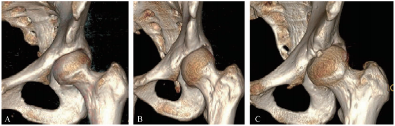 AIIS的位置和形态与SSI的形成密切相关,Hetsroni通过CT三维重建对AIIS的形态进行了临床分型(图1):Ⅰ型AIIS,其下缘和髋臼骨性边缘界限清晰并存在平缓的髋臼骨壁;Ⅱ型AIIS,其下缘延伸到髋臼骨性边缘,两者界限难以分清;Ⅲ型AIIS,其下缘向下突出超过髋臼骨性边缘。Ⅱ和Ⅲ型AIIS可能导致髋关节屈曲和内旋活动度受限,也可能是盂唇损伤的潜在解剖因素。