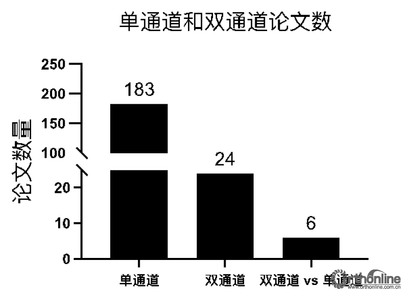 我们将最后的论文进行进一步分类:文献关键词聚类分析图(见图1)。主要热点方向为单通道脊柱内镜相关论文192篇,双通道脊柱内镜论文24篇,其中单-双通道脊柱内镜比较的论文占6篇(见图2)。
