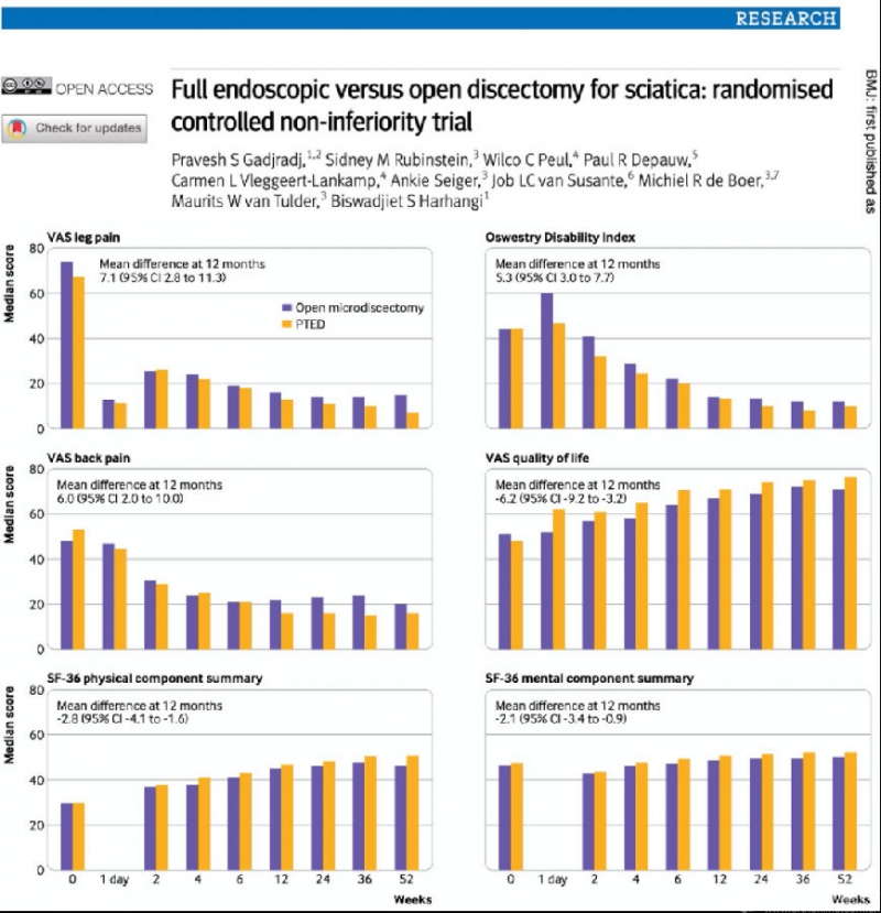 (引自:P. S. Gadjradj, S. M. Rubinstein, W. C. Peul, P. R. Depauw, C. L. Vleggeert-Lankamp, A. Seiger, et al. Full endoscopic versus open discectomy for sciatica: randomised controlled non-inferiority trial. BMJ 2022; 376:e065846)