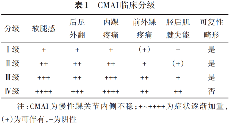 CMAI分级分为4级:Ⅰ级,疼痛位置主要在内踝,偶尔表现打软腿及前外踝疼痛,胫后肌腱功能尚可,后足轻度外翻,为可复性畸形;Ⅱ级,内踝疼痛明显加重,软腿感较Ⅰ型更常见;Ⅲ级,除了Ⅱ级临床表现外,胫后肌腱功能下降明显;Ⅳ级,除了疼痛症状明显加重外,胫后肌腱无力症状更为明显,出现第一跖骨隆起征或假性拇外翻等,进展为僵硬性畸形。