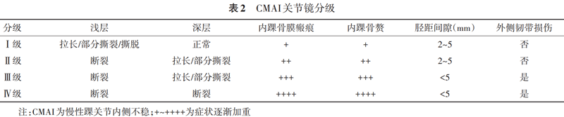 CMAI关节镜下表现分为4级:Ⅰ级,三角韧带浅层撕裂/拉长,深层正常,可见内踝骨膜瘢痕及内踝骨赘,胫距间隙仍然在正常范围之内,外侧副韧带没有损伤;Ⅱ级,浅层断裂或缺如,深层部分撕裂或拉长,内踝骨膜瘢痕及内踝骨赘更为明显;Ⅲ级,除了Ⅱ级表现外,同时合并外侧韧带损伤;Ⅳ级,除了Ⅲ级表现外,三角韧带深层断裂或缺如。根据三角韧带位置分为3型:近端撕裂/撕脱为A型,最常见;中断撕裂为B型;远端撕裂/撕脱或合并弹簧韧带损伤为C型。他们认为,慢性踝关节内侧不稳的机制为下胫腓前韧带断裂后,后足内旋度增加,进一步加重踝关节内侧韧带的应力,进而导致慢性踝关节旋转不稳定(即外侧和内侧联合不稳定),而异常增宽的距骨体合并胫骨穹隆覆盖率较小的这种踝关节类型会更容易发生慢性旋转性踝关节不稳定。