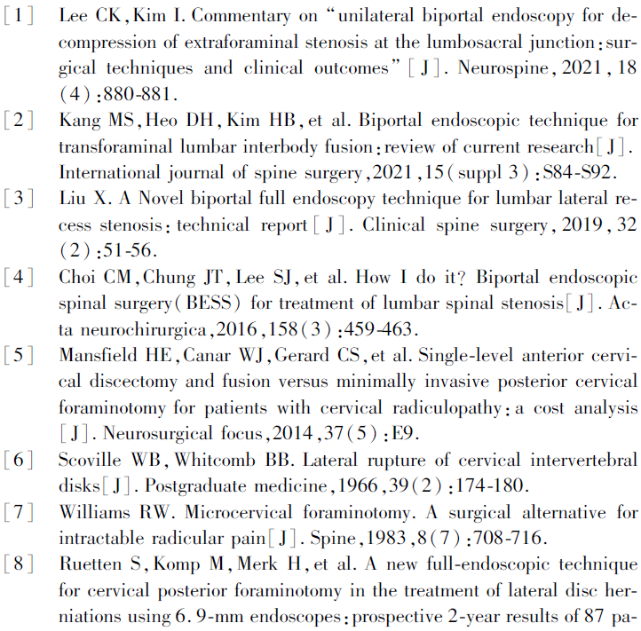 Kim等[12]对单通道内镜、UBE和显微镜下的微创后路颈椎椎间孔成形术的影像学和中期疗效进行了比较,发现三种类型的手术均取得了良好的临床疗效和足够的椎间孔区域的扩大,相较显微镜组,两个内镜组均显示了更大的关节突关节潜行减压的倾斜角度和更低的关节突切除率。