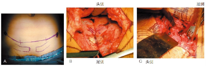 在耻骨联合上方2cm做横切口(技术图1A)。切开皮肤,用大号锐爪拉钩拉开,在腹直肌筋膜表面分离。沿腹白线筋膜做纵行切口。注意不要剥离腹直肌止点,即使一侧腹直肌常因外伤已经从耻骨支撕脱(技术图1B)。