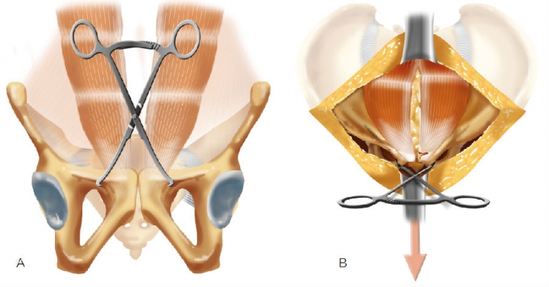 技术图2 A.用Weber钳或者大号持骨钳复位耻骨联合,使钳尖夹在耻骨体部腹直肌前方同一水平位置。B.钳向远侧倾斜,使钳尖嵌入。