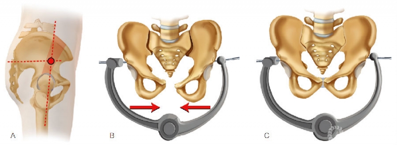 如前所述,C型钳可用于不稳定的前后挤压型骨盆骨折又需要剖腹探查者,也可作为无法进入手术室接受手术的患者的临时骨盆固定器。如果一般的钳子无法维持复位,它也可用于耻骨联合的开放复位。这类似于 Wright 等描述的帮助骨盆后环复位的概念。