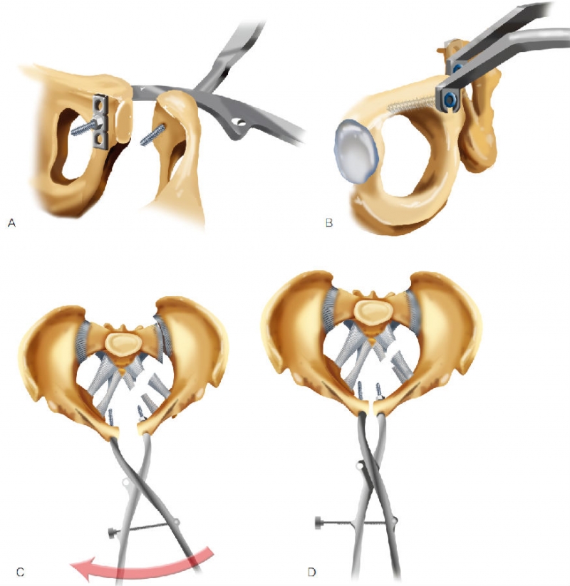 注意如果有耻骨支骨折,不要过度复位。这一技术的目标是获得大部分复位,然后暴露耻骨联合,再按通常步骤用Weber钳精确复位。