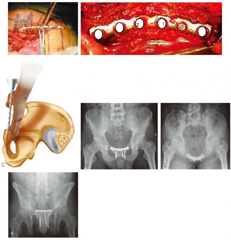 起初几枚螺钉应在耻骨体内轻度向前和向外侧成角,使得在骨中达到最大把持力。必要时这些螺钉可向下打入坐骨。耻骨联合两边,靠内侧的两枚螺钉可以彼此平行,也可在耻骨联合体内交叉(技术图5D~F)。