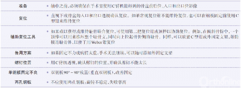 进手术室前应确认有无任何腹部手术史或者以前的手术切口。所需的设备应包括C臂机、透视床、大号复位钳、外固定支架工具和C型钳。
