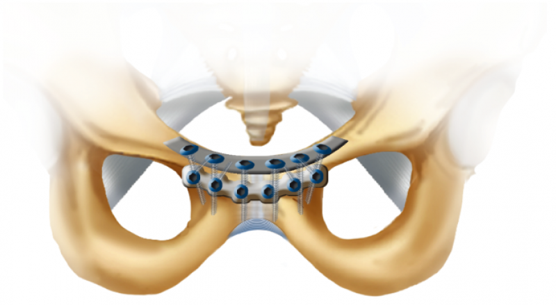 固定以前,应使用C臂机透视前后、入口和出口位,确认复位。耻骨联合复位后,将一块6孔3.5mm弧形重建板或解剖型钢板跨耻骨联合放置。可以在耻骨联合的纤维软骨盘中放置一枚克氏针作为定位,以便使钢板中置。