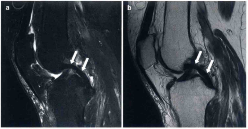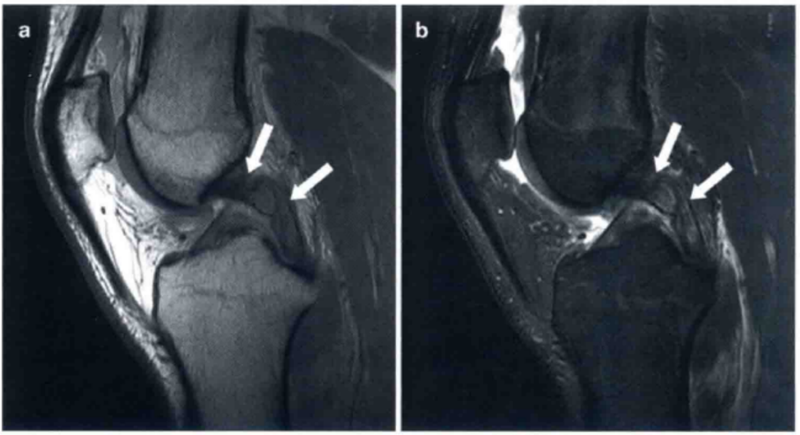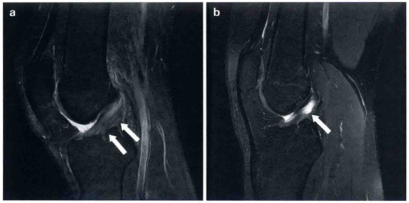 图9 a和b显示的为矢状位质子加权像和T2上PCL损伤的图像(箭头)。PCL变厚、水肿,但不是完全的断裂