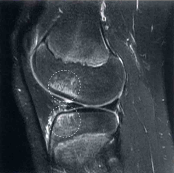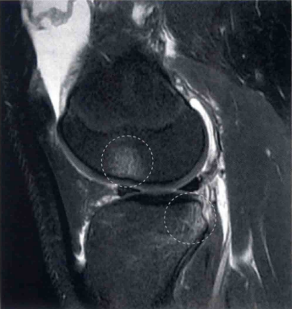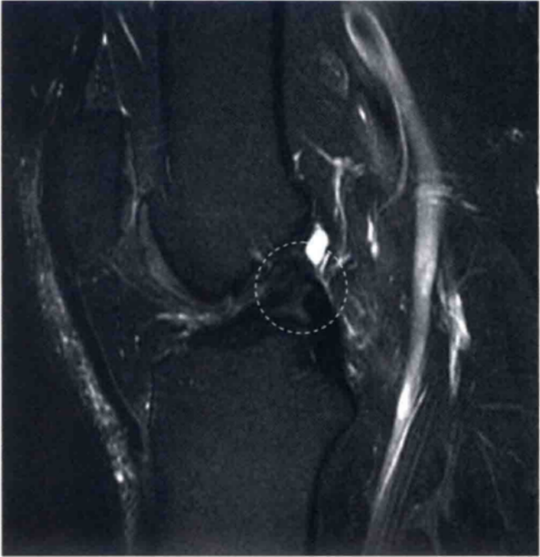 图6 显示了典型的轴移骨损伤,常见于急性ACL损伤。可见一处沟槽样凹陷性损伤,分别位于外侧股骨髁和后外侧胫骨平台(圆形区)
