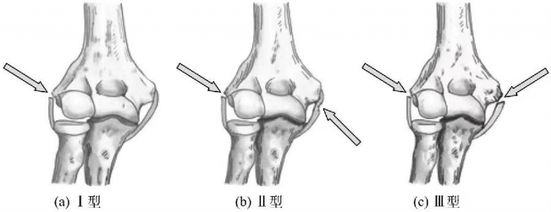答:对于肘关节恐怖三联征,术前行肘关节MRI检查,根据MRI检查结果可将患者的韧带损伤类型分为3型(图1):