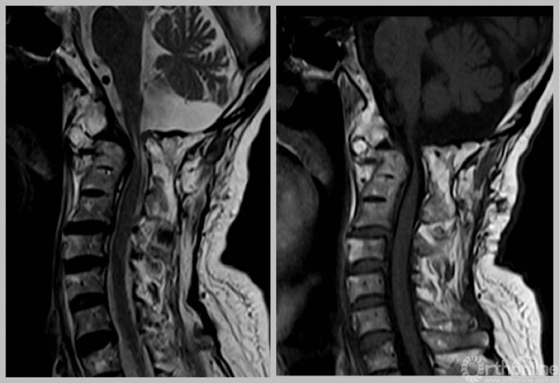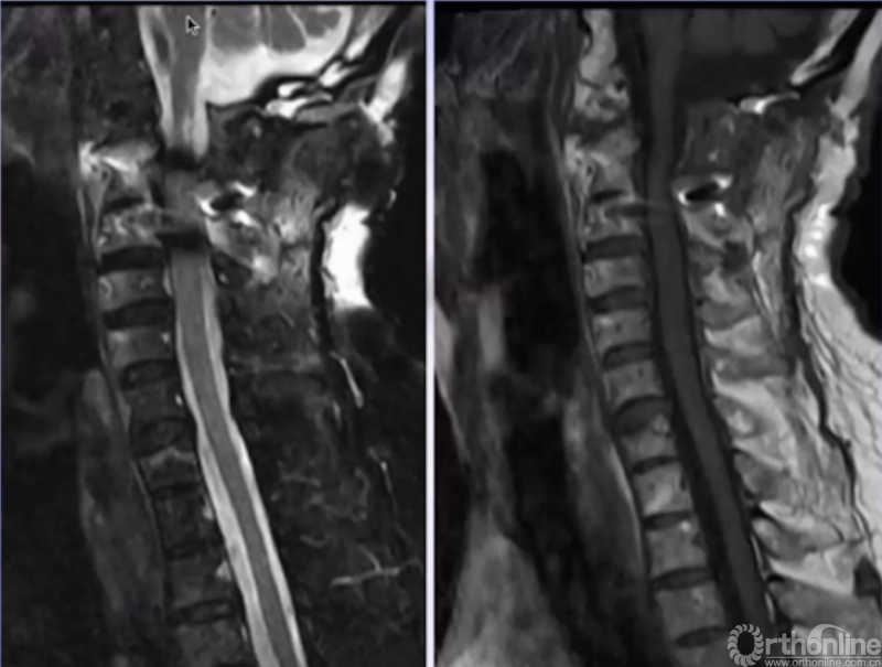枕颈融合术后21年,术后神经功能无明显改善,但症状稳定;3年前出现四肢麻木、乏力加重,行走不稳;1周前出现气促、声音低、吞咽困难。