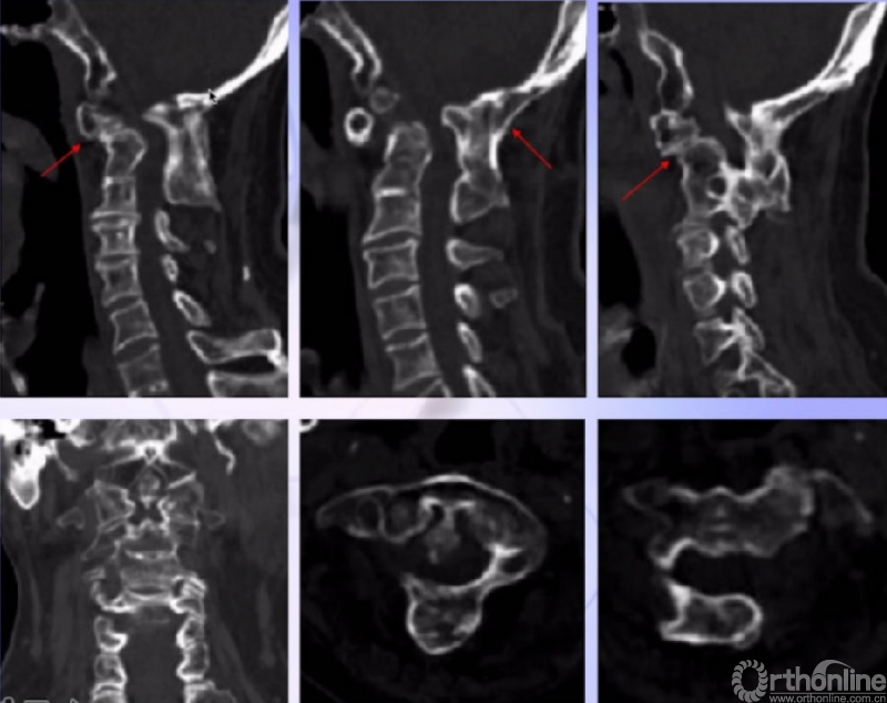 5. 枕颈融合术后,通过有效松解(截骨)仍能使齿状突复位。此类患者首选单一后路手术治疗;部分患者需通过前、后路联合手术进行松解,才能使齿状突获得满意的复位。