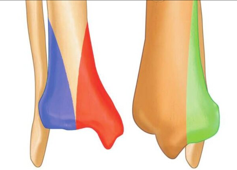 图2 胫骨远端解剖分区,红色内侧柱;蓝色外侧柱;绿色后侧柱