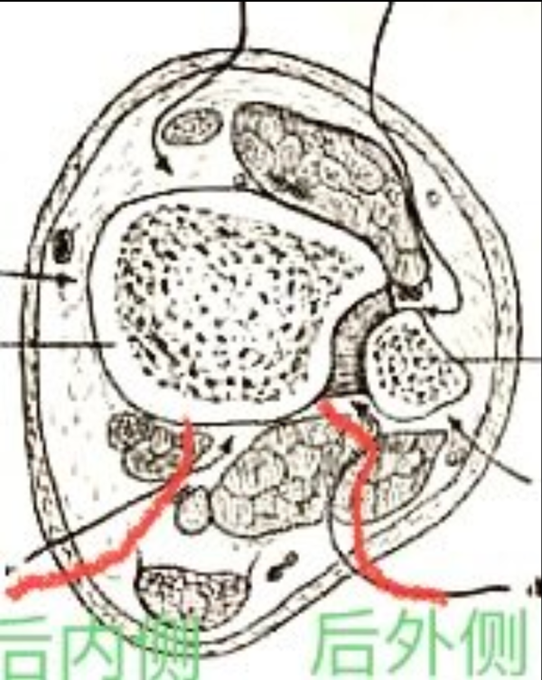 6、外踝后缘纵行切口。显露外踝,复位固定。然后钝性分离腓骨肌腱和踇长屈肌间隙,向前牵开腓骨肌并向后牵开屈拇长肌和跟腱显露胫骨远端后柱及后侧穹隆。