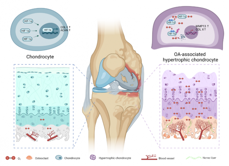 针对上述问题,上海大学转化医学研究院苏佳灿、井莹莹/长海医院创伤骨科陈晓团队首次实现小鼠活体关节氧分压实时动态测量,证实OA早期软骨下骨过度激活的破骨细胞促进H型血管生成,引起关节氧微环境改变,是OA发生进展的关键环节,维持软骨下骨低氧微环境可有效延缓OA进展。