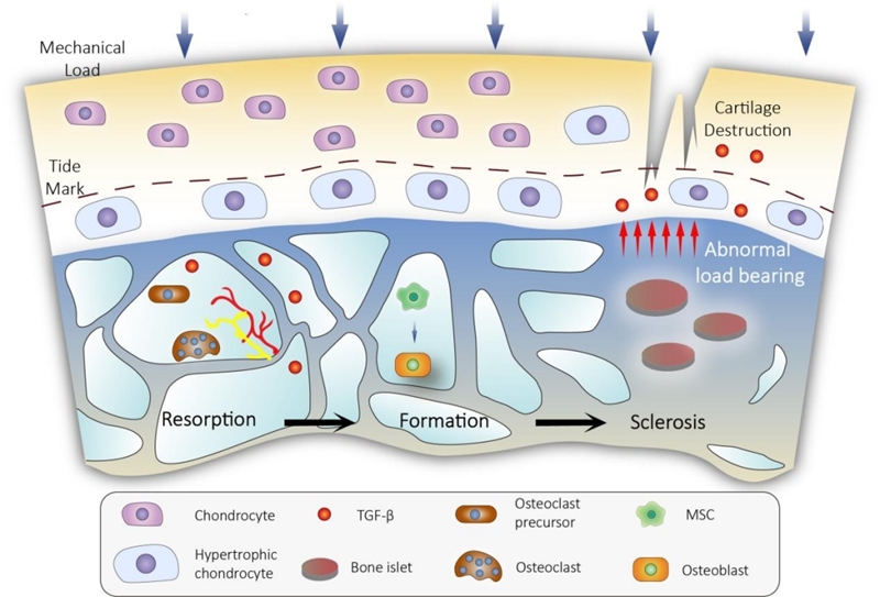 骨关节炎(Osteoarthritis, OA)是一种以关节软骨退变、软骨下骨异常改建、骨赘形成和关节炎症为主要特征的全关节疾病。软骨下骨改变与OA发生进展密切相关:OA软骨下骨早期表现为骨吸收,晚期表现为骨硬化,软骨下骨病变与软骨退变存在紧密时空关联,但其作用机理长期困扰学界。
