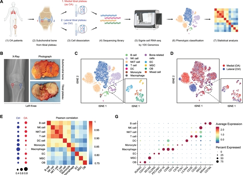 通过对行全膝关节置换术的患者软骨下骨细胞进行单细胞测序,确定了两种新的内皮细胞(EC)群体,一群介导外泌体合成和炎症反应,一群影响血管功能和血管生成。发现了三个成骨细胞亚型,分别与血管形成、基质合成和基质矿化有关。研究进一步讨论了这些新表型在OA发展中的独特作用和功能,以及这些亚群之间的相互作用网络。在内侧半月板不稳定的小鼠模型中证实了每个群体的变化趋势。软骨下骨区ECs和OBs的细胞类型的确定表明了一种新的分类和机制,为OA发病过程中软骨下骨的生理和病理行为提供了新的见解。
