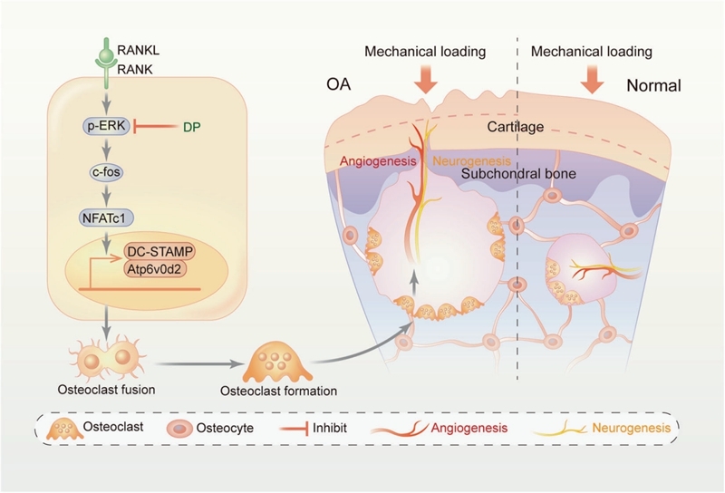 该研究建立了二维/骨髓单核细胞/细胞膜层析/飞行时间质谱技术,发现邻苯二甲酸二丁酯(DP)是抑制破骨细胞生成的有效成分。探讨了DP在OA小鼠模型中的治疗效果,发现DP可抑制软骨下骨中过度活化的破骨细胞生成,并改善关节软骨恶化,抑制软骨下骨髓中异常的H型血管形成,减轻OA疼痛。在机制上,DP通过抑制ERK/c-fos/NFATc1通路抑制破骨细胞融合,从而延缓破骨细胞的形成。DP还下调了细胞中DC-STAMP和Atp6v0d2的表达。研究证明DP通过抑制异常破骨细胞生成和软骨下骨相关的血管生成和神经生成来阻止OA的进展。为靶向软骨下骨破骨细胞异常激活治疗骨关节炎提供了依据。