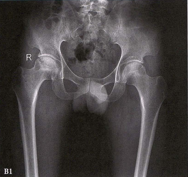 Ⅳ期:X线片显示股骨头变扁,关节间隙变窄,髋臼出现硬化、囊性变和骨赘。