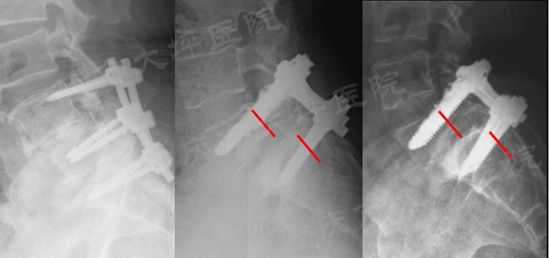 课题组前期的回顾性病例对照研究证实,单侧使用PMMA螺钉(2颗)与双侧使用PMMA螺钉(4颗)具有相近的临床疗效,成功将PMMA螺钉使用的推荐数量从4颗减少为2颗。进一步观察发现,普通椎弓根螺钉失效模式为“雨刮效应”(图2)。